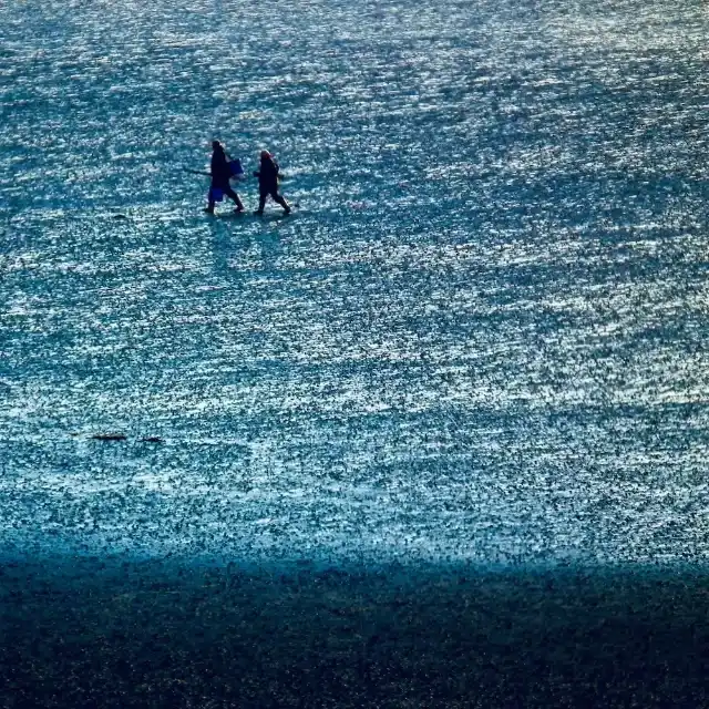 On it stood two of what I assumed must be indigenous creatures. Both were dressed in flowing fabrics. One was tall, maybe two and half metres, and was wearing red. The other was about a metre tall and wearing green. They each had two eyes, one mouth, two arm limbs, two leg limbs and flowing white hair that emerged from beneath their tall caps. They were waving at us, and smiling.